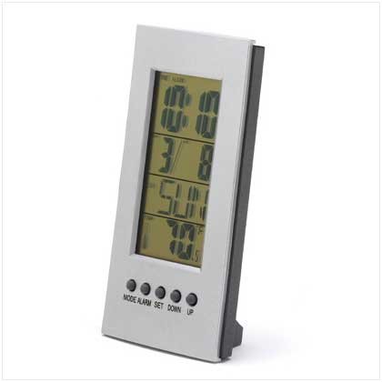 Be on time for work, play or adventure- any time, anywhere! Mini information station travel alarm clock shows day, date, time and temperature. Plastic and glass. Two LR1130 button cell batteries included. 2 1/8" x 1" x 4 1/8" high.You will not be disappointed with