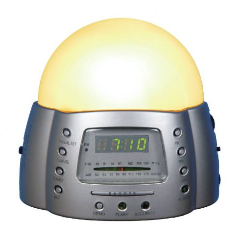 Like a sunrise, the Soleil Sunrise Alarm Clock's light/dawn simulator wakes you naturally and peacefully for the day ahead. The light alarm gradually increases the intensity of it's special built in light, simulating a natural sunrise. Your body wakes instinctively, as if waking with the light of the sun. This natural method of waking up is good for all individuals but especially for those sensitive to noisy alarms. Clinical studies at the National Institute of Health indicate that waking to light has been known to help people with Seasonal Affective Disorder (SAD), various forms of depression and sleep disorders to overcome their problems by increasing daytime every, limiting winter weight gain and allowing them to wake up easier. Features: Customize your sunrise: gradual intensification of simulated sunrise can be activated over intervals of time ranging from 0 to 120 minutes. Built-in clock and AM/FM radio. Easy to read digital display. Battery back-up in case of a power outage. Flash & Beeper back up: set the alarm to beep and/or the light to flash at the end of your sunrise cycle. Perfect for heavy sleepers. Super-bright krypton bulb. Snooze button. Nap timer can be set for intervals between 15 and 120 minutes. Sunset feature: gives your body the signal to wind down, helping you to fall asleep. Great for the kids room! Security setting: turns on the lamp at random intervals to give the impression that someone is home. Compact size: 5" x 4.5" x 3 (13cm x 11cm x 7.6cm). Works with travel converters. UL approved transformer.You will not be disappointed with
